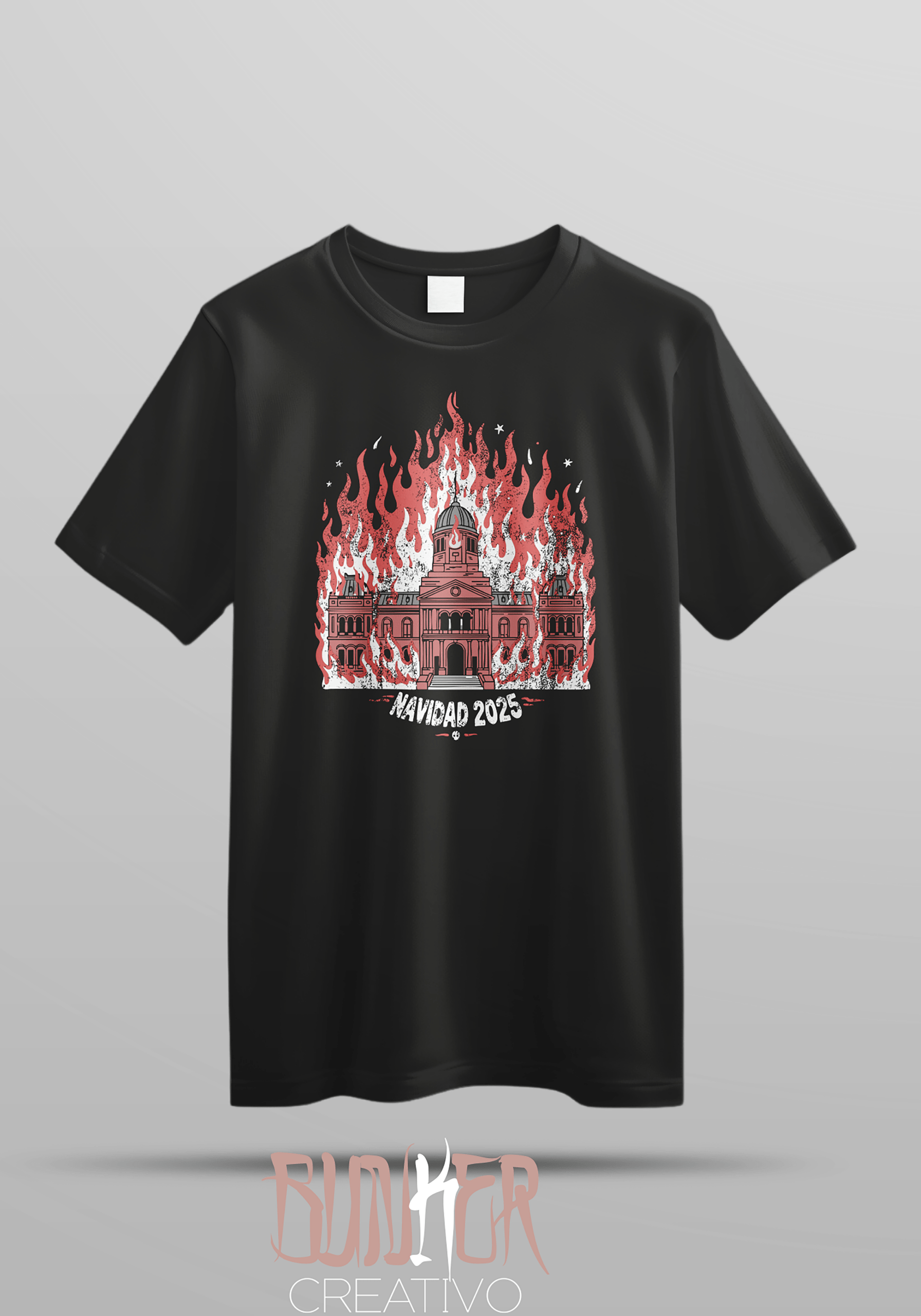 El diseño muestra una arquitectura institucional ardiendo en llamas, construida desde una estética de graffiti político y street art combativo. No hay sutileza ni metáfora amable: el fuego es accion, consecuencia y hartazgo acumulado. La imagen remite directamente al inminente estallido social que viene fermentando en cada laburante, en cada pibe con hambre, en cada jubilado que elige comida o remedios; bajo una falsa calma. El texto “Navidad 2025” funciona como ironía pura: una fecha asociada al consumo, la familia feliz y la paz forzada, enfrentada a una realidad que no cierra por ningún lado.